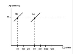 . На рисунках 1 и 2 представлена зависимость «доза-эффект» для двух условных лекарственных веществ А и Б. Используя данные графиков, определите имеет ли лекарственное вещество А, больший терапевтический индекс чем лекарственное вещество Б.